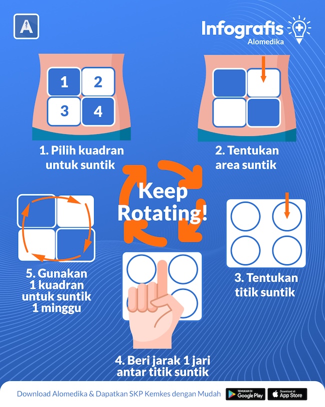 - Lakukan rotasi lokasi injeksi: bagi area injeksi menjadi kuadran dan gunakan satu kuadran per minggu. Lokasi injeksi diberi jarak sekitar 1 cm untuk menghindari trauma ulang jaringan.[16-18]