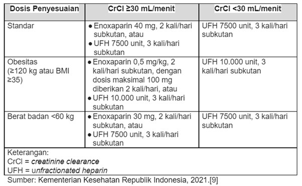Pemberian antikoagulan profilaksis dapat dipilih antara LMWH 0,4 mL (40 mg), diberikan 1 kali setiap hari melalui injeksi subkutan, atau UFH 5.000 unit 2 kali/hari secara subkutan. Peningkatan dosis profilaksis antikoagulan diberikan pada pasien kritis, termasuk pasien saat atau setelah dirawat di unit intensif sesuai dengan tabel dibawah. [9]