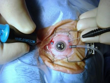 - Tempatkan 3 alat utama pada insisi yang telah dibuat (kanula infus mata, pipa lampu fiberoptik, dan aspirator vitrektomi)